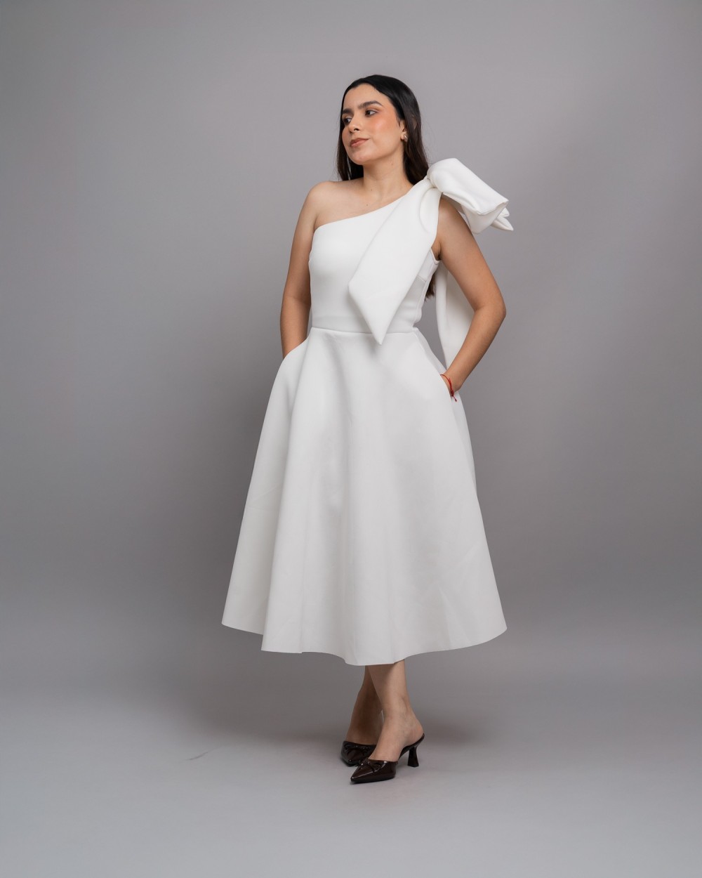 Vestido con corte asimétrico en la parte de los hombros y un lazo en el hombro izquierdo