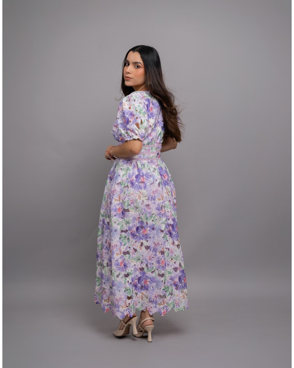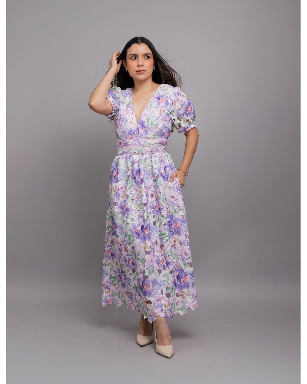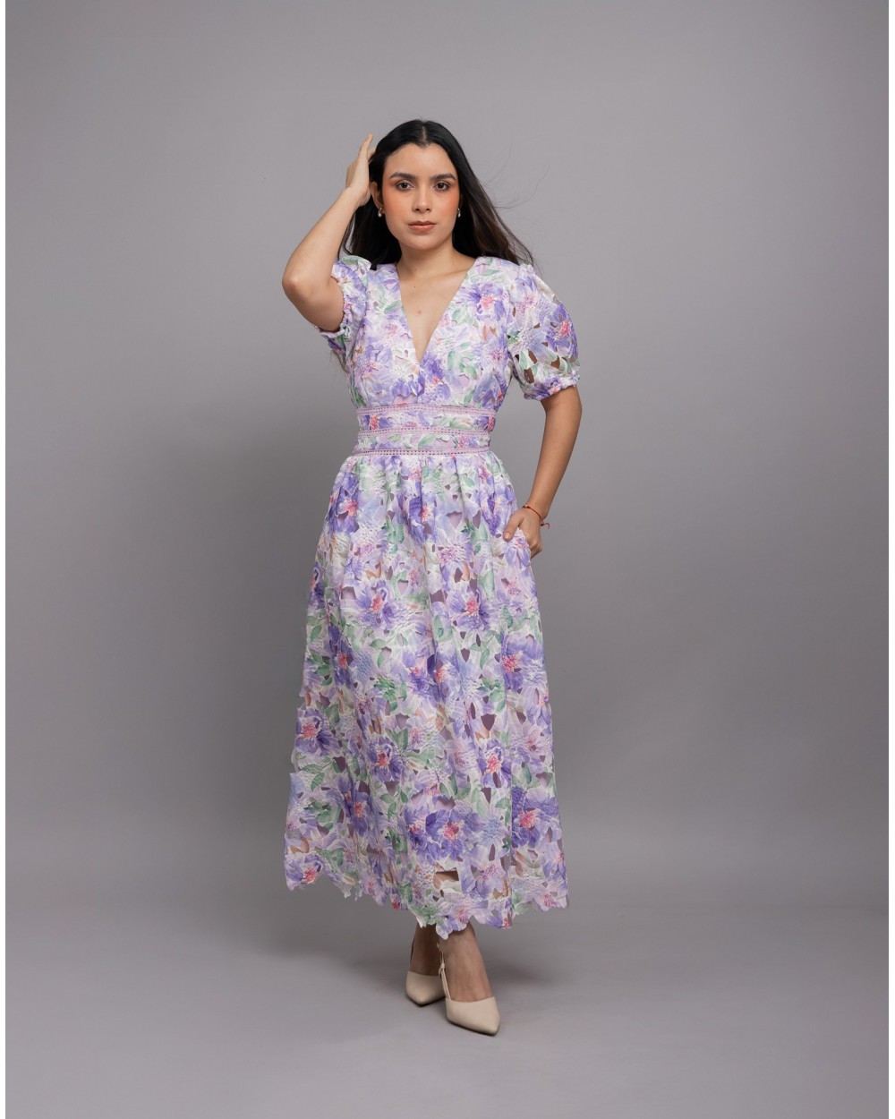 Vestido midi con encaje acampanado floral con cuello en V